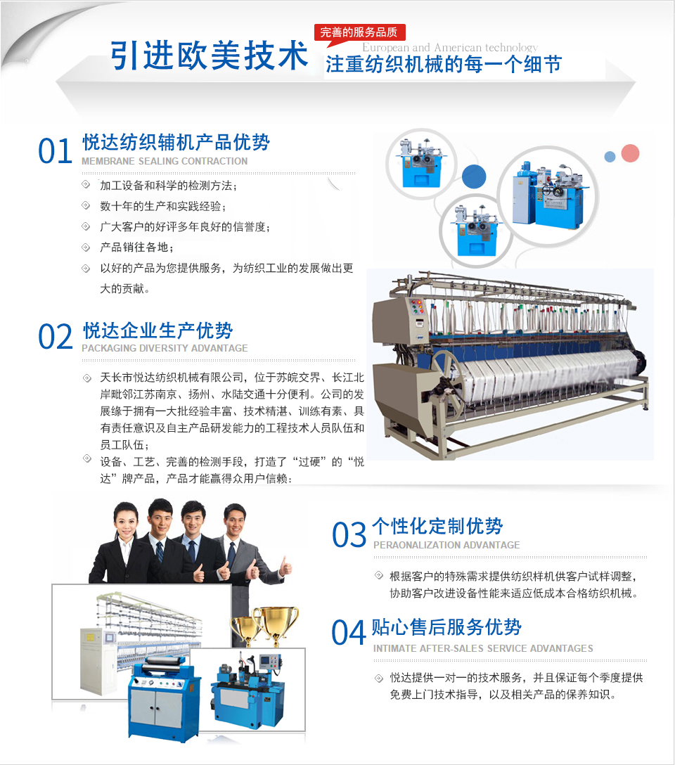 天長市悅達紡織機械有限公司座落在皖東天長市仁和集鎮(zhèn)人民西路88號,公司位于蘇皖交界、長江北岸毗鄰江蘇南京、揚州、水陸交通十分便利。 公司是主要生產(chǎn)紡織平車安裝工具、紡部輔件及配件綜合性企業(yè)。已有二十多年的生產(chǎn)歷史,在激烈的市場競爭中始終保持優(yōu)良的質(zhì)量、優(yōu)化的價格、齊全的品種優(yōu)勢。產(chǎn)品暢銷全國各地,深受新老客戶的好評。 公司以服務客戶滿足用戶為己任,不斷提高產(chǎn)品加工精度,拓展系列品種,以高標準、高起點滿足客戶需求。公司精神:創(chuàng)新、開拓、務實。公司宗旨:追求誠信、追求質(zhì)量、追求服務、為用戶著想。